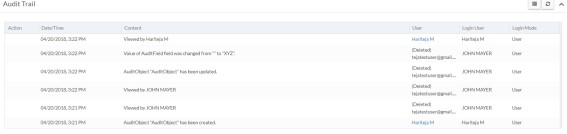 Platform automatically tracks some activities, and you can enable additional logging as described below. Audit trail entries are created automatically for activities such as creating, merging, and converting records. Platform also creates audit trail entries when an administrative user makes changes to an object definition or an application. The Audit Trail component at the bottom of the object definition or application definition contains these entries.