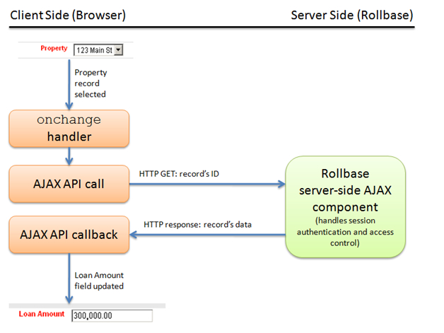 Consider the following example: A Platform page includes a lookup field (see Relationships between objects) for a property and an amount for a proposed mortgage. Upon selection of the property, we want to use the property's value as the default for the mortgage amount. This means a server-side trip using the AJAX API, as illustrated below.