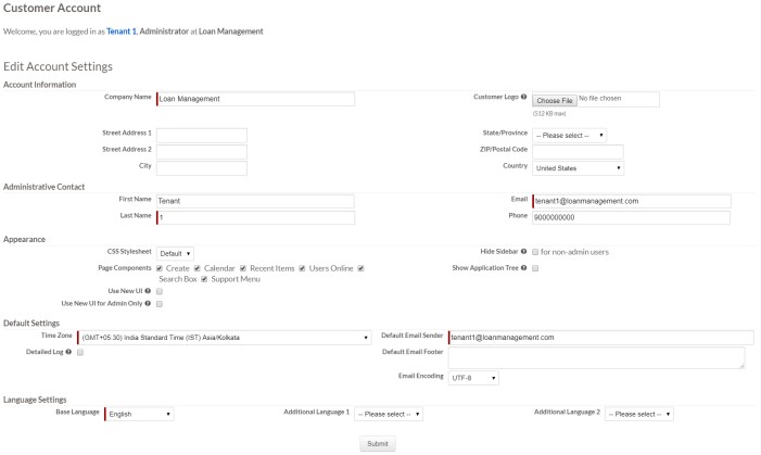 - Administration contact: Specifies the name, email, and phone number of the administrator of the tenant. This can be used in your template and formula fields.