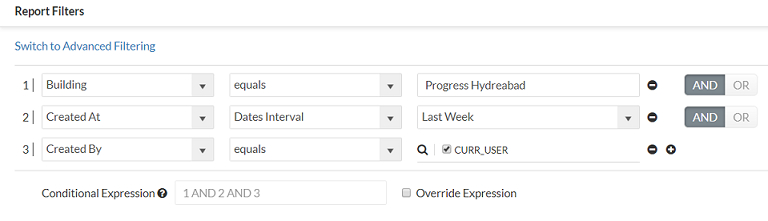 You can modify the conditional expression value by selecting the Override Expression checkbox . If the checkbox is selected, the expression value doesn't get auto-generated even on modification of filters. Also, AND/OR toggle buttons are hidden.