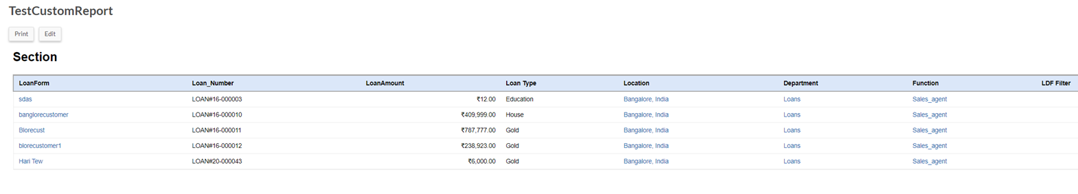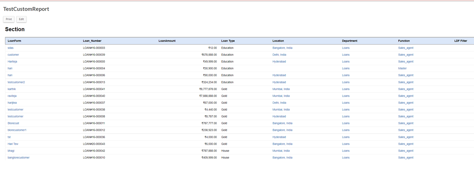 Similarly, the following display the differences in the Custom Reports between an ADMIN and a USER with LDF enabled respectively.