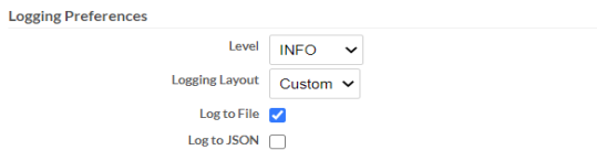 • Custom: In the Custom logging layout, the user can define to log the files by selecting either of Log to File and Log to JSON, or both.