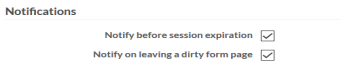 • Notify on leaving a dirty form page: Select this option to configure so that Platform will notify you before a session expires and/or before leaving a dirty form (New, Edit) page: If either of these options is deselected, you will not receive that type of notification.