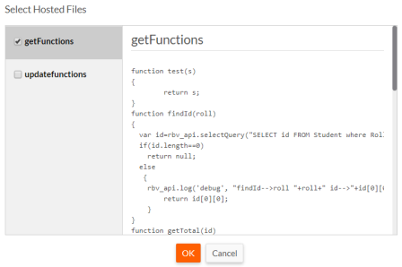 • Hosted Files - Provision to attach hosted files to a script (can be chosen for each HTTP verb). Hosted files can be used to combine javascript code that can be commonly used in different custom methods. These files are resolved as regular javascript files.
