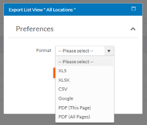 Platform provides export capabilities from views and reports. The header part of each view component contains links to export the view's records in XLS, XLSX, CVS, a spreadsheet in Google Docs (see Integrating with Google applications.) or PDF. The following screen shows all the export formats available for a view in Platform: