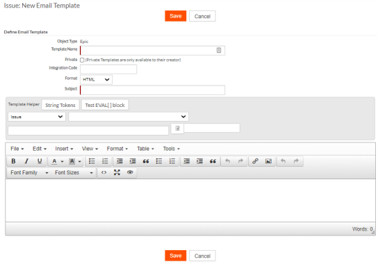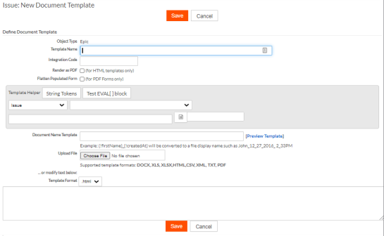 An HTML template report can be created for “Object type” and similar to other entities the context is as per the selection of object type. For example, the following HTML Template report is created for the “Epic” object type and the template helper shows the fields in the context of Epic & Default type.