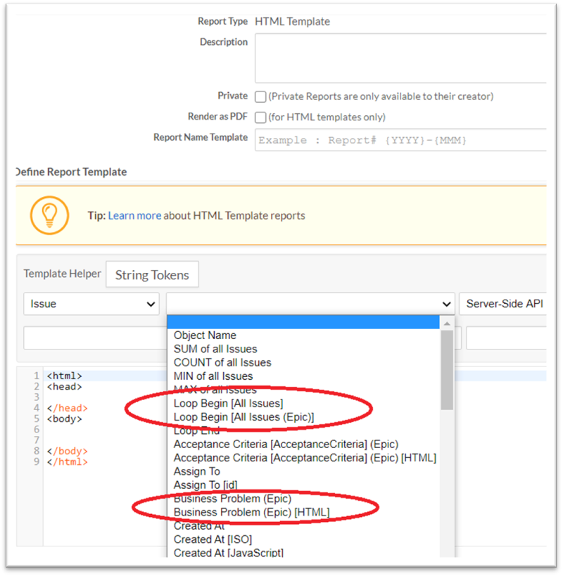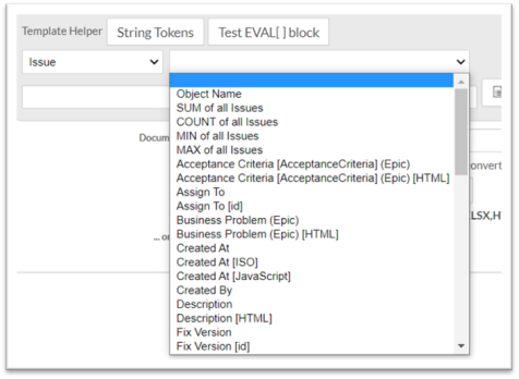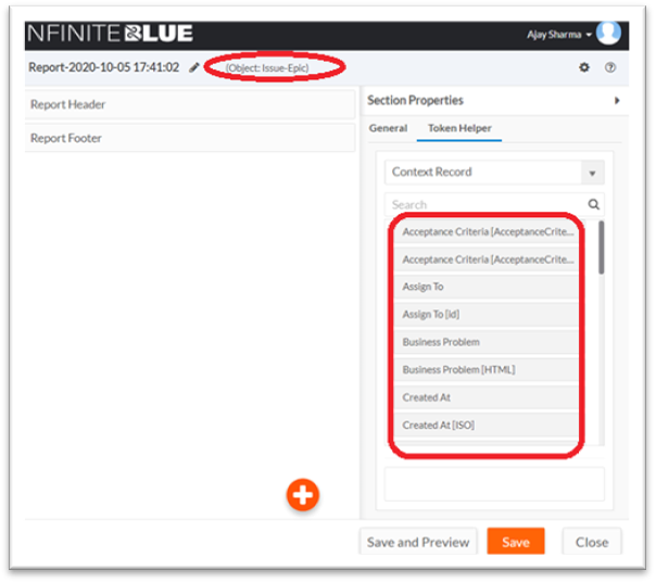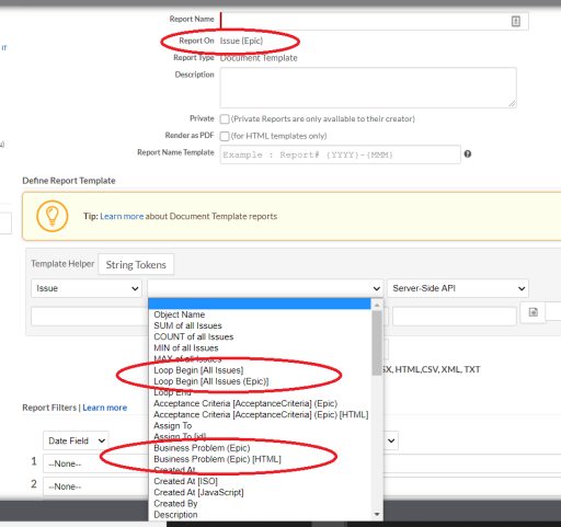A record specific custom report can be created for a specific “Object Type” where all the fields are listed from the “Default” and “Object type”. For example, the following report is built for the “Epic” object type and the token helper shows all the fields from the “Default” and “Epic” object type.