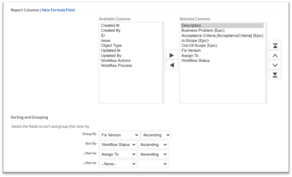 The tabular report can be built for any specific object type and the context for the reports is the “object Type” for which the report is created. This report is not available in other Object Type. For example, a tabular report is created for Epic status by Fix Version, sorted by Workflow Status & Assigned to and can have further layers (using Epic-Release relationship) added if the Epic is spread across versions/releases.
