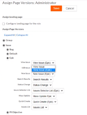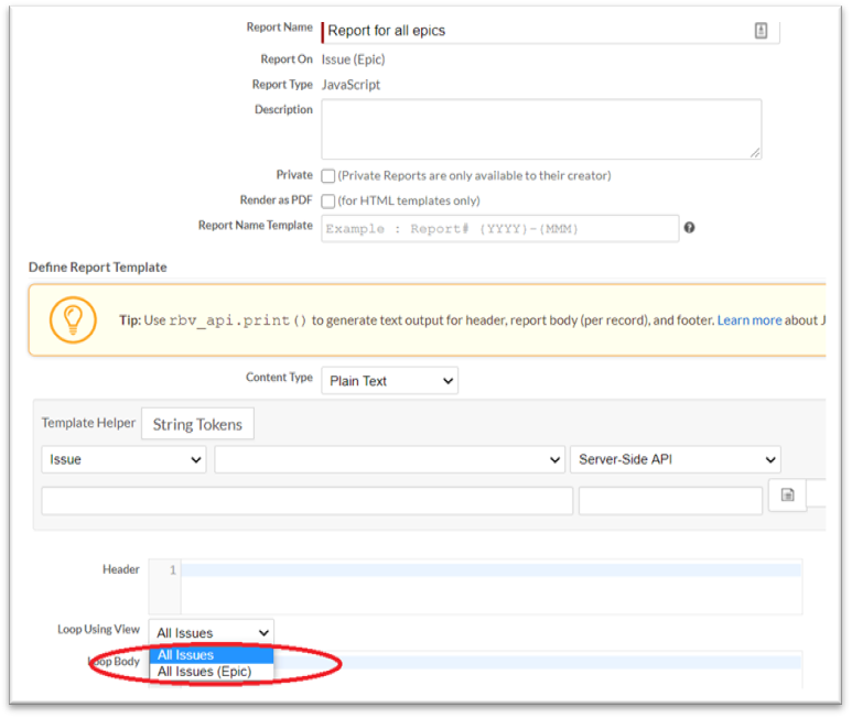 A javascript report can be created for the “Object Type” and the report needs to be in the context of the corresponding object type for which the report is created. For example, the following javascript report for the “Epic” type shows views of “Default” and “Epic” type for looping.