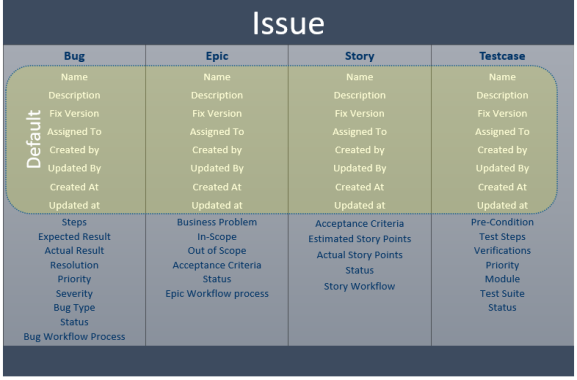 The fields listed under the “Default” type are common across all other object types and each type is extended from the Default by adding its own fields and workflow.