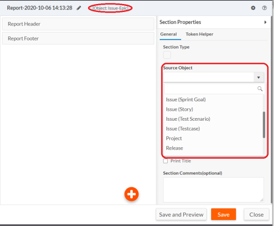 All section types do support the object types. For Sub-Report Section Type, the report drop-down populates the non-custom reports of the Default type and the type of the parent report. For example, the following All record custom report is created for the “Epic” object type and in the source object dropdown, only types associated with the application are listed if app context is available.