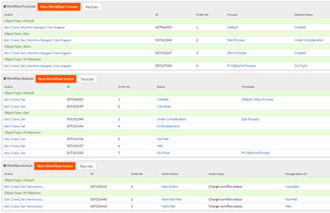 Workflow can be defined for any object type where each process belongs to a specific object type. The process defined for the “Default” type is available for every other object. The same implies to “Workflow Action” and “Workflow Status”.