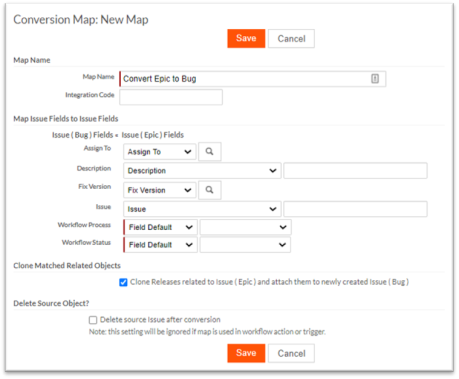 For example, the following data map is created to convert the record of “Epic” to “Bug” type.