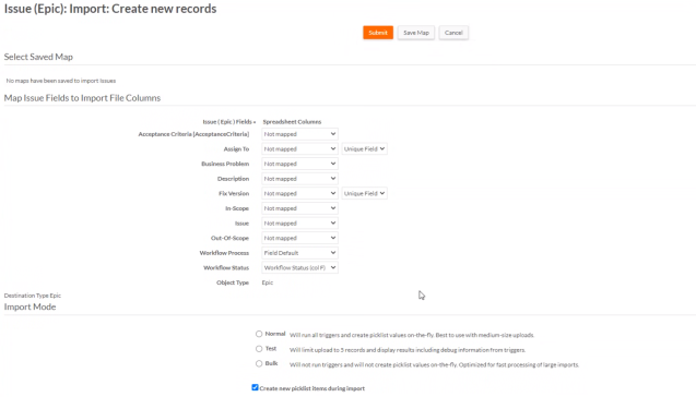 From the existing use-case scenario, on selection of a specific object type (Epic), the subsequent pages display Issue (Epic) accordingly. In the field mapping screen, only the object type specific and all the default type fields are displayed. That includes the object type displaying the set value (Epic).