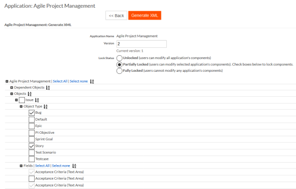 During the application xml export/import, selection of any entity is possible at the object type level even for a partial locked application. Herewith, selecting "TYPE-1" also ensures all other fields, triggers etc which are part of TYPE-1 are also selected.