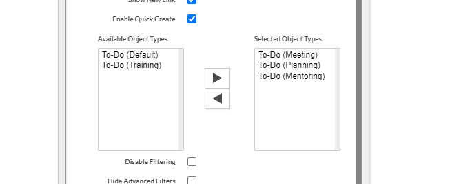 The Selected Object Types section list out the object types which are available for list views and record creations.