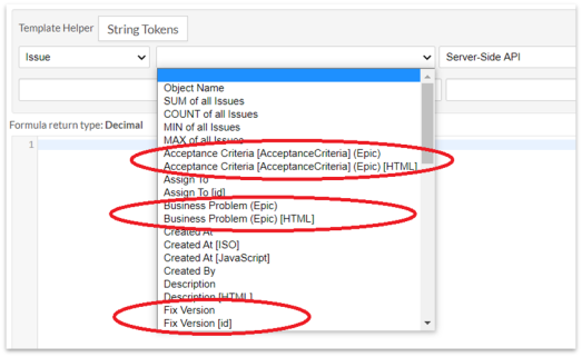 In the Formula field, the template helper has all fields from the “Default” type and “Epic” object type.