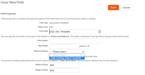 For example, while creating a template for Epic type, the app developer can view the following options in the template helper. All the fields of the “Default” type and “Epic” type can be accessed by the app developer where the Epic type fields are marked with object type name appended with the field name.