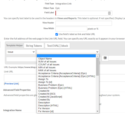 An integration link field can be created in the context of the corresponding object type and the template helper shows the fields related to the Object type along with the “Default” type.