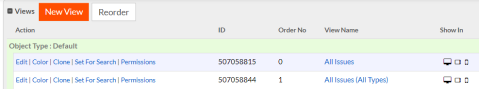 Views are also supported for the Object Types like Objects. On enabling the “Object Type” attribute a default view “All <Object Name> (All type>)” is created which will show all records of all type. Along with it on creation of any “Object Type”, an “All <Object name> (<Object Type>)” is also created. This view works within the context of the specific object type. This view created for the specific object type has all the fields of “Default” type and the fields added to that specific type and will not include fields from any other user-defined object type.