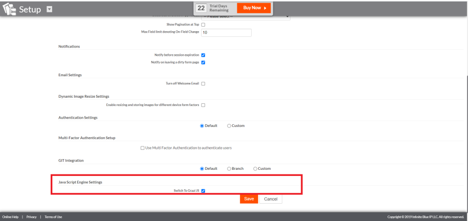 In conjunction with the above shared property, a new tenant level property, Switch To Graal JS has been added to switch JS engine selection. This tenant property is shown only when the above shared property is checked.
