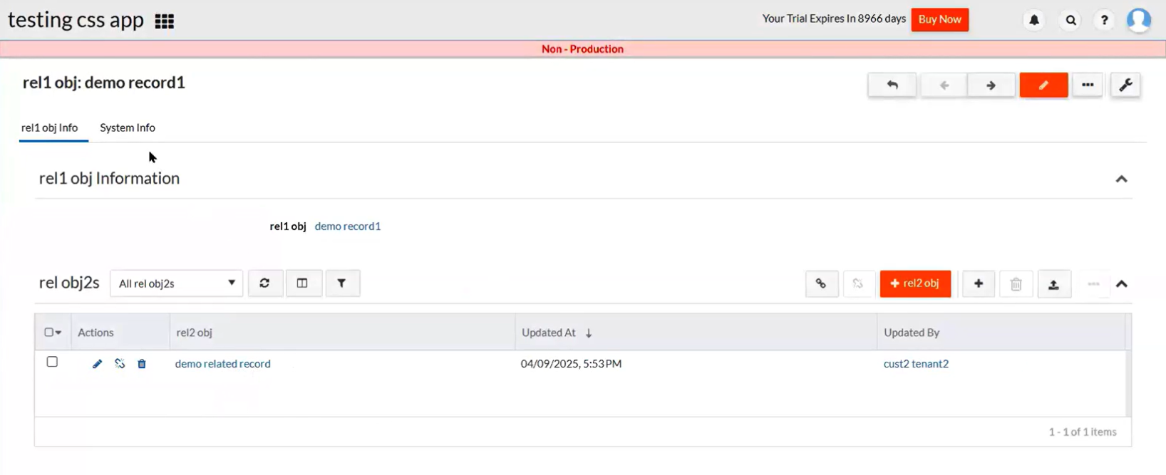 • A parent record (demo record1) is opened, and the creation of a related record (demo related record) via Quick Create is initiated.