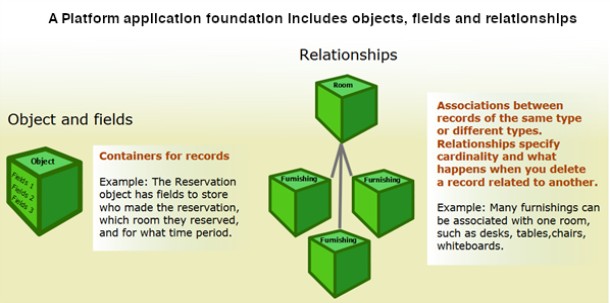 The Platform development environment supports citizen developers and business users who want to create custom applications. Its framework of wizards and dialogs provide drag-and-drop and point-and-click convenience. You can create sophisticated applications without writing a line of code, but you also have the option to use standards such as JavaScript and HTML to customize the logic and user interface. To get started, you define a foundation for your app, by creating objects, their fields, and relationships between objects.