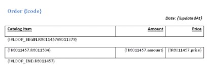 You can upload Microsoft Word documents (Only DOCX extension) and use them as Document Templates. The following graphic shows an example of a Microsoft Word document template, which includes tokens from a base record (Order) that includes a loop through related items. The body of the loop represents a Microsoft Word table with a single row:
