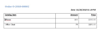 The graphic below shows the parsed template populated with real data. You can see that original tokens are replaced with actual values and the styles of the Microsoft Word document are preserved. The date field uses the date format configured in the current user's tenant. The loop through related records now includes a table row for each related record (under the Catalog Item column).