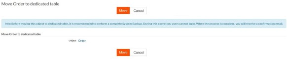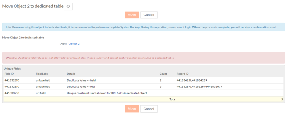 On the Move Object to a dedicated table confirmation screen, if the object to be moved contains any duplicated field values of the fields that are marked Unique, then Move option is disabled. In this case, either the data must be fixed or the fields must be unmarked as Unique. These fields can be marked as unique again after the data is fixed.