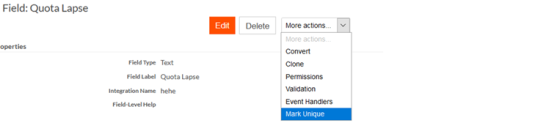 On the fieldView page, click Mark Uniquefrom the More actions dropdown list.