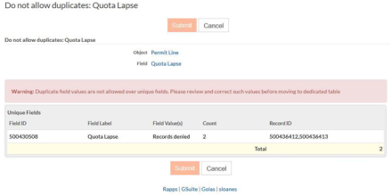 The user is navigated to a page similar to Move object to Dedicated Tables. Any duplicate field values (if found) are displayed from the existing records set. The user can also click Submit and mark the field Unique.
