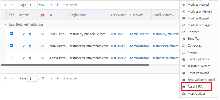 Administrator Reset: MASTER or TENANT administrators can reset MFA for users from the User Record List View.