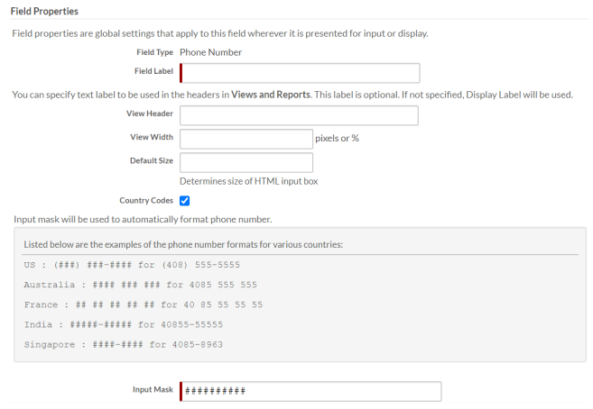 Country Codes — While adding the phone number field from the object definition, to prefix country code to a phone number, the Country Codes option is checked by default. If unchecked, the country code selection drop down will not be displayed for this phone number field.