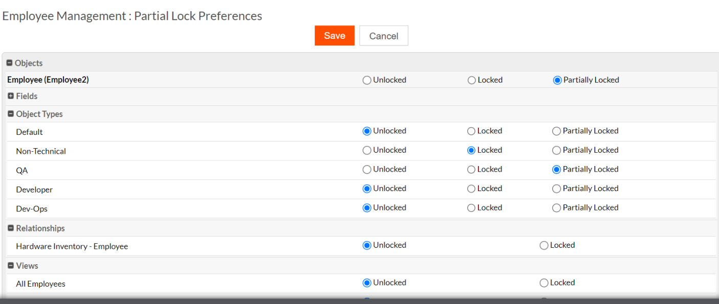 The More Actions menu on the application setup page includes a Partial Lock Preferences option. For every component supporting partial locking, you can select Unlocked, Partially Locked or Locked radio buttons.