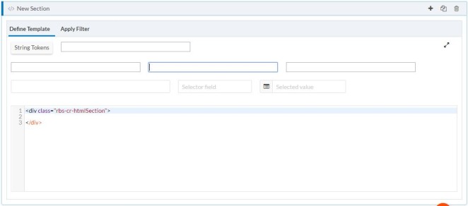 When you select HTML Template as the section type, an HTML Template section that includes two tabs, Define Template and Apply Filter is added.