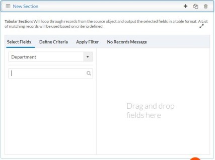 Tabular section will loop through records from the source object and output the selected fields in a table format. You must select at least one field in tabular section to save the report. Tabular section consists of four tabs: Select Fields, Define Criteria, Apply Filter, and No Records Message.