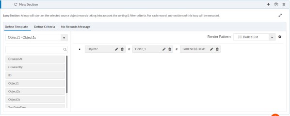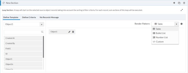 The enhanced custom report editor offers greater flexibility and control to create all sorts of content using loop sections. In a loop section, you can choose the fields and render the output in different formats for report generation in a loop section. For example, you can drag & drop fields and have Table, Bullet List, Number List & Custom formatted render patterns where a loop starts on the selected source object records taking into account the sorting and filter criteria applied. For each record, sub-sections of this loop will also be executed.