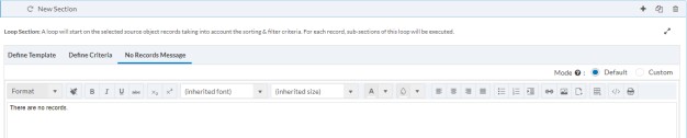 Rich text editor. By default, this mode is set for adding No Records Message in the Table type of render pattern.