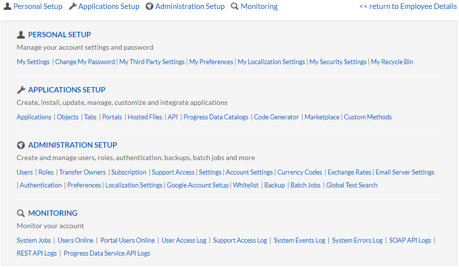 Users with an administrative role can configure personal, application, and account settings from the Setup home page. Users without administrative privileges can only configure their personal settings using the Update Profile option in the user profile menu.