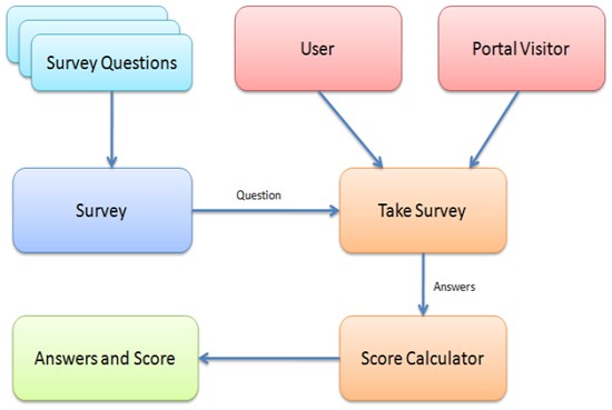 Surveys provide a way to quickly assemble groups of questions and to process answers from users or portal users. Survey questions can include ranking criteria to act as online quizzes or tests. Surveys allow you to associate different groups of fields with records of the same object. The diagram below illustrates how surveys work. You create the questions, the survey, and optional ranking criteria. Users and portal visitors can take the survey; Platform saves the answers and calculates the score.