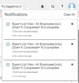 The UI notification center displays job completed/error notifications until cleared. Click on the Bell icon on the top right corner of the record view page to pull down the UI notification center.