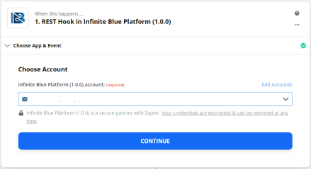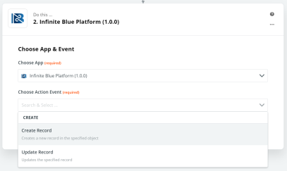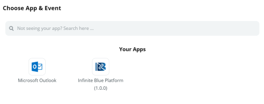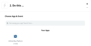 In the Choose App & Event section search bar, find and select the Infinite Blue Platform application from Your Apps section.