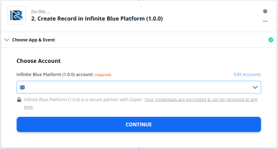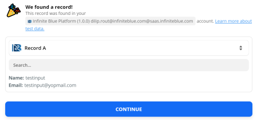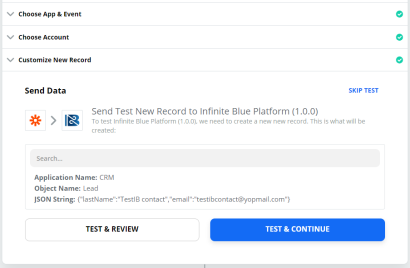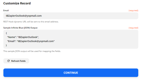 Enter the Email & Sample Infinite Blue JSON Output fields in the Customize Record section, and click Continue.
