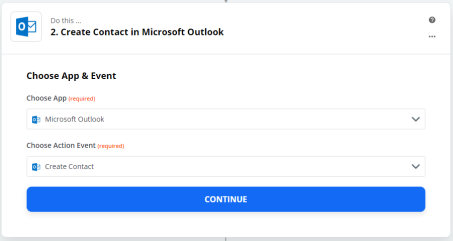 In the Choose App & Event section, select Create Contact from Choose Action Event dropdown and click Continue.