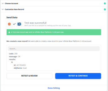 A new record should be created in the Lead object of the Infinite Blue Platform. (You may verify the same by logging into Infinite Blue Platform.) Once done, click RETEST & CONTINUE and finish the setup by clicking on Done Editing.