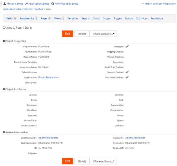 - The shaded ribbon at the top contains links to subcomponent sections, where you can create, edit, or delete object subcomponents, such as Fields, Relationships, and Pages.
